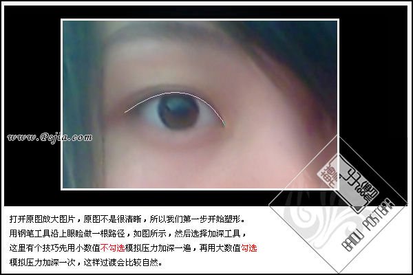 原圖 最終效果 1、打開原圖,放大,原圖不是很清晰,所以我們第一步開始塑形。 用鋼筆工具沿上眼瞼畫一根路徑,如圖,然后選擇加深工具,這里有個小技巧,先用小數值不勾選模擬