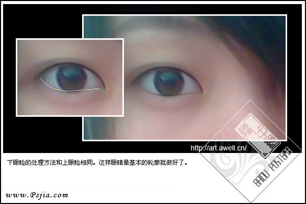 2、下眼瞼的處理方法和上眼瞼一樣,這樣眼睛最基本的輪廓就做好了。