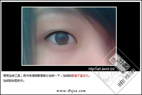 3、再用加深工具,中間調,把眼尾部分加深一下,加深的數值不宜過大,加深后效果如下: