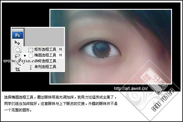 4、選擇橢圓選框工具,圈出眼珠,用高光調加深,我用力過猛變成全黑了,同學們適當加深就好,注意眼珠與上下眼皮的交接,外露的眼珠并不是一個完整的圓形。