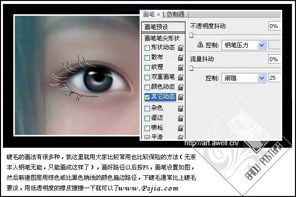 9、睫毛的畫法有多種,我這里就用大家比較常用也比較保險的方法(無奈本人鋼筆無能,只能畫成這樣了),畫好路徑后按F5設置畫筆,如圖,然后新建圖層用棕色或比黑色稍淺的顏色描邊路徑,下睫毛通常比上睫毛要淡,用低透明度的橡皮擦擦一下就可以了。