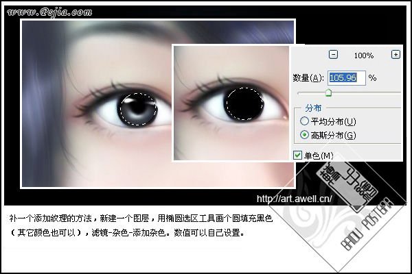 12、補一個添加紋理的方法,新建一個圖層,用橢圓選框工具畫一個圓,填充黑色(其它顏色也可以),濾鏡—雜色—添加雜色,數值可以自已設置。
