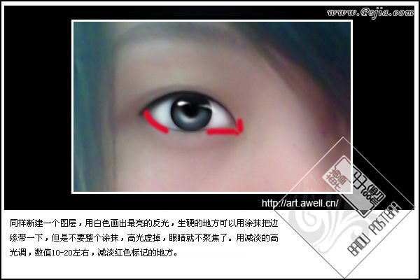 7、同樣新建一個圖層,用白色畫出最亮的反光,生硬的地方可以用涂抹工具把邊緣帶一下,但是不是整個涂抹,高光虛掉,眼睛就不聚集了,用減淡的高光調,數值10-20左右,減淡下眼皮眼角的地方。