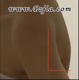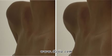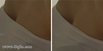 6.原片胸部輪廓不是很明顯,使之變大不太可行。我們可以通過改變乳溝來讓胸部顯得豐滿一些,還需要稍稍移動乳溝的位置。調整前后效果如圖11所示。