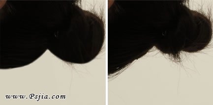 5.發型的調整。散亂的發型會使照片感覺粗糙,這里只需要使用液化工具將兩個“圓球”修改圓潤即可。調整前后效果如圖10所示。